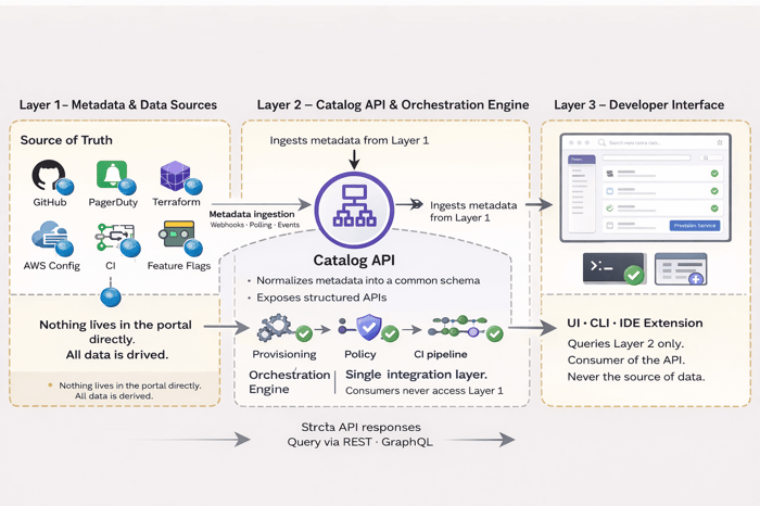 Layer 1 - Metadata & Data Sources: This is your source of truth. GitHub, PagerDuty, Terraform state, AWS Config, your CI system, your feature flag service. Nothing lives in the portal directly; everything is derived.