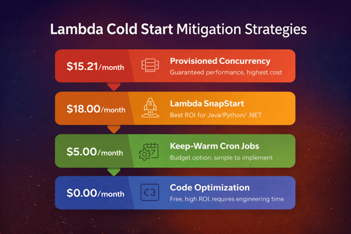 Warning: Many teams overspend on mitigation. It is not uncommon to spend $500/month on provisioned concurrency to solve what is effectively a $50 problem. Profile your cold start rate and p99 impact before committing to provisioned capacity.